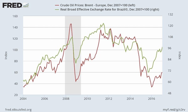 O gráfico 1 apresenta a forte correlação entre os preços do petróleo e do Real em relação ao dólar.