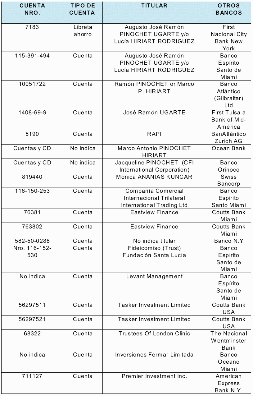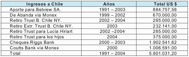 Inversiones en el extranjero.- Efectuado el recuento de los distintos depósitos y con la documentación reunida hasta ahora por el tribunal, en cuanto a capital, intereses y dividendos, de las inversiones de Augusto Pinochet Ugarte y Lucía Hiriart Rodríguez en el extranjero, suman un total de US $ 26.992.712,02. Los cuales resultan de la suma de cuentas en los Bancos Riggs de Londres; Riggs Washington; Riggs Miami; Espirito Santo de Miami; Banco de Chile Nueva York; Banco de Chile Miami, Lehman Brothers N.Y., Coutts Bank de Miami, Citibank N.Y., Citibank Miami, Cititrust Bahamas Limited, Firts National City Bank, Firts Tulsa a Bank of Amèrica, a lo que se suman transferencias de fondos desde los Bancos Atlántico de Nueva York; Banco Atlántico de Gibraltar; Banco Atlántico se Zurich; Bank of Bahamas; Sun Bank de USA; Swiss Corp; Bank of América; American Express Bank N.Y., Banco Océano Miami. Los cuales se desglosan en US$258.818,72 correspondientes al total de intereses generados por los saldos mantenidos en las cuentas; US$4.419.464,64 correspondientes al total de los intereses ingresados a las cuentas producto de los certificados de depósito, intereses de inversiones a través de las cuentas, dividendos obtenidos de los trusts, utilidades de inversiones y; US$22.314.432,66 correspondientes al total de los depósitos de capital ingresados a estas cuentas.