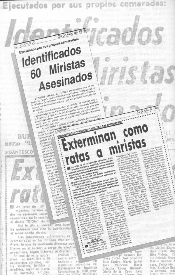 «El Mercurio» del día 23 de julio entrega en Chile la información. Curiosa- mente escribe ahora en páginas interiores y en forma escueta un subtítulo que dice: « Ejecutados por sus propios camaradas», y en letras más grandes dice: «IDENTIFICADOS 60 MIRISTAS ASESINADOS», Buenos Aires, 22 UPI: «De acuerdo con el semanario LEA, la siguiente es la nómina de miristas chilenos que habrían sido eliminados en los últimos 3 meses por sus propios compañeros de lucha», y agrega: «estas eliminaciones -dice la revista- se habrían registrado en Argentina, Colombia, Venezuela, Panamá, México y Francia y es la culminación de un largo proceso de divergencias, mutuas recriminaciones y disputas por dinero». «El Mercurio» entrega la lista.