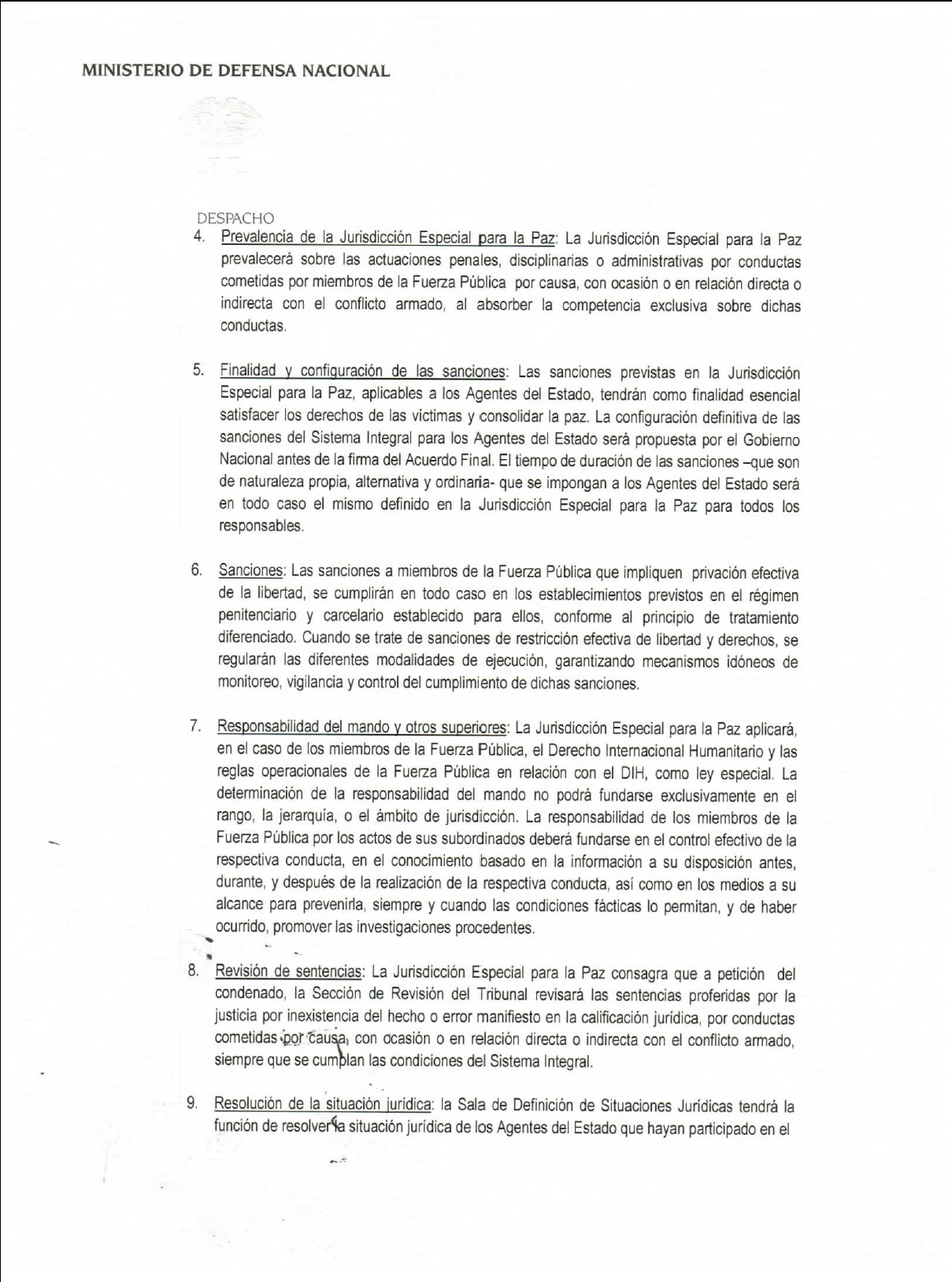 El Gobierno Nacional y los colombianos reconocemos el sacrificio y la entrega que durante décadas han demostrado las Fuerzas Militares, la Policía Nacional y en general los Agentes del Estado, en la búsqueda permanente para garantizar la protección de todos los colombianos. El Estado reconoce que en el desarrollo del conflicto se han cometido violaciones a los derechos humanos e infracciones al DIH.