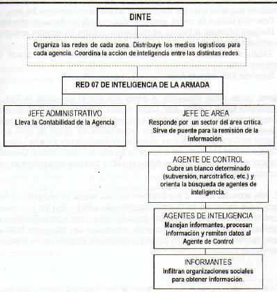 "En cuanto a la Red misma, para su manejo operacional y administrativo se cuenta con un Jefe de Red, quien coordina y controla los objetos de inteligencia, la recepción y difusión de información a los apoyados ya la Dirección y supervisa a los Jefes de Área; Jefe de Área, persona que mantiene enterado al Jefe de Red a través de "mecanismos secretos", conoce la problemática del sector, establece prioridades y asigna a los agentes de control los sitios donde se deberá reclutar los informantes; Agente de Control, depende en forma directa del Jefe de Área, dirige y evalúa a los informantes y difunden la información a través de los agentes de Control; finalmente se cuenta con los informantes, personas que obtienen la información en el blanco asignado (tráficos de armas y/o de estupefacientes, subversión y delincuencia organizada) y en la medida de lo posible solo debe conocer al Agente de Inteligencia. Respecto de estos últimos se contempla su relevo, entre otras razones por violar la ley. Para retirar al Agente se utiliza como método disminuir misiones, asignar misiones de poca importancia, contactos menos asiduos. Dar razón aceptable para la despedida, mantener la armonía." (15)