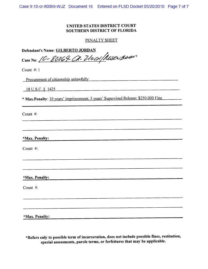 7. On or about July 19, 1999, in Palm Beach County, in the Southern District of Florida, the defendant, GILBERTO JORDAN, appeared before a naturalization examiner for an interview based on his Form N-400 Application, at which time he was placed under oath and affirmed under penalty of perjury that the statements he had earlier provided on the N-400 form were true and correct. On August 25,1999, the defendant, GILBERTO JORDAN, was sworn in as a United States citizen in Miami Beach, Florida.